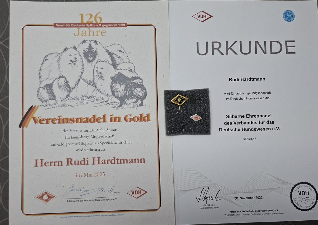 Die goldene Ehrennadel des Vereins für Deutsche Spitze E.V sowie die silberne Ehrennadel des VDH.